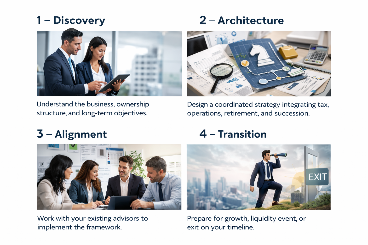 Our process begins with understanding where you want the business and your personal wealth to lead — then building the structure around that destination.